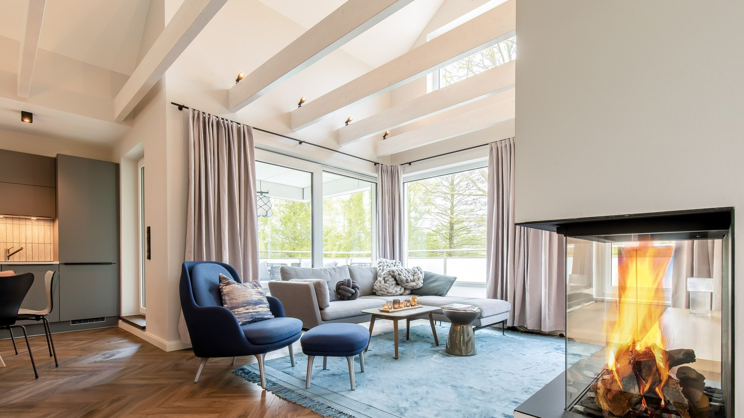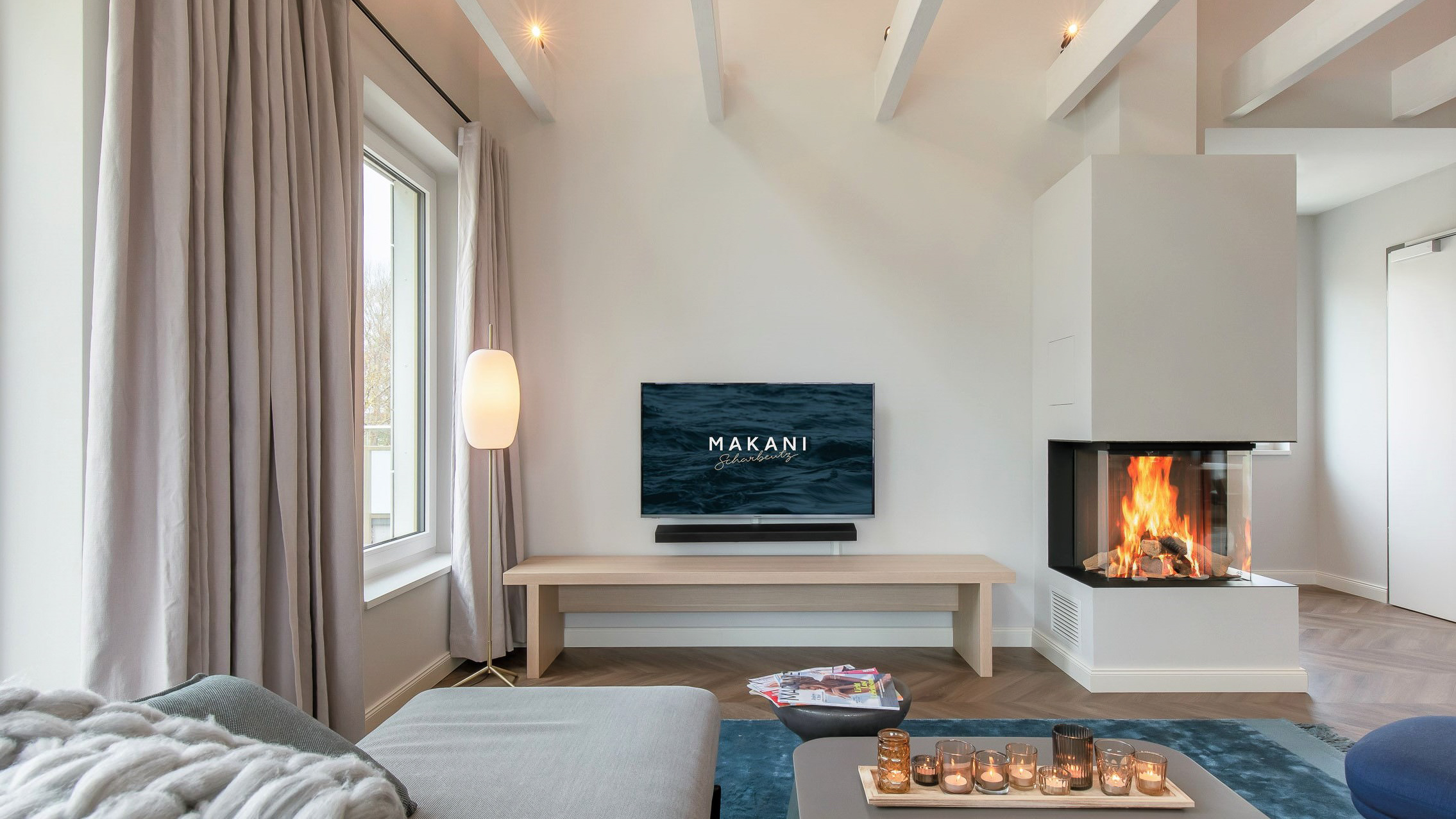 Das Design des Staffelgeschosses von Makani erwartet vier bis sechs Gäste auf zwei Ebenen. Sie treten ein und befinden sich sofort im großzügigen Wohnbereich. Hier steht auch der Ofen, der zu kuscheligen Abendstunden einlädt. Die Ofenwärme reicht bis zu dem runden Esstisch, gegenüber der modernen und optimal ausgestatteten Küche. Die hohe Decke reicht bis zum Spitzboden hinauf und mündet dort in einer Galerie. An der kompletten Westseite des Appartements erstreckt sich die Dachterrasse, die ums Eck bis auf die Südseite reicht.