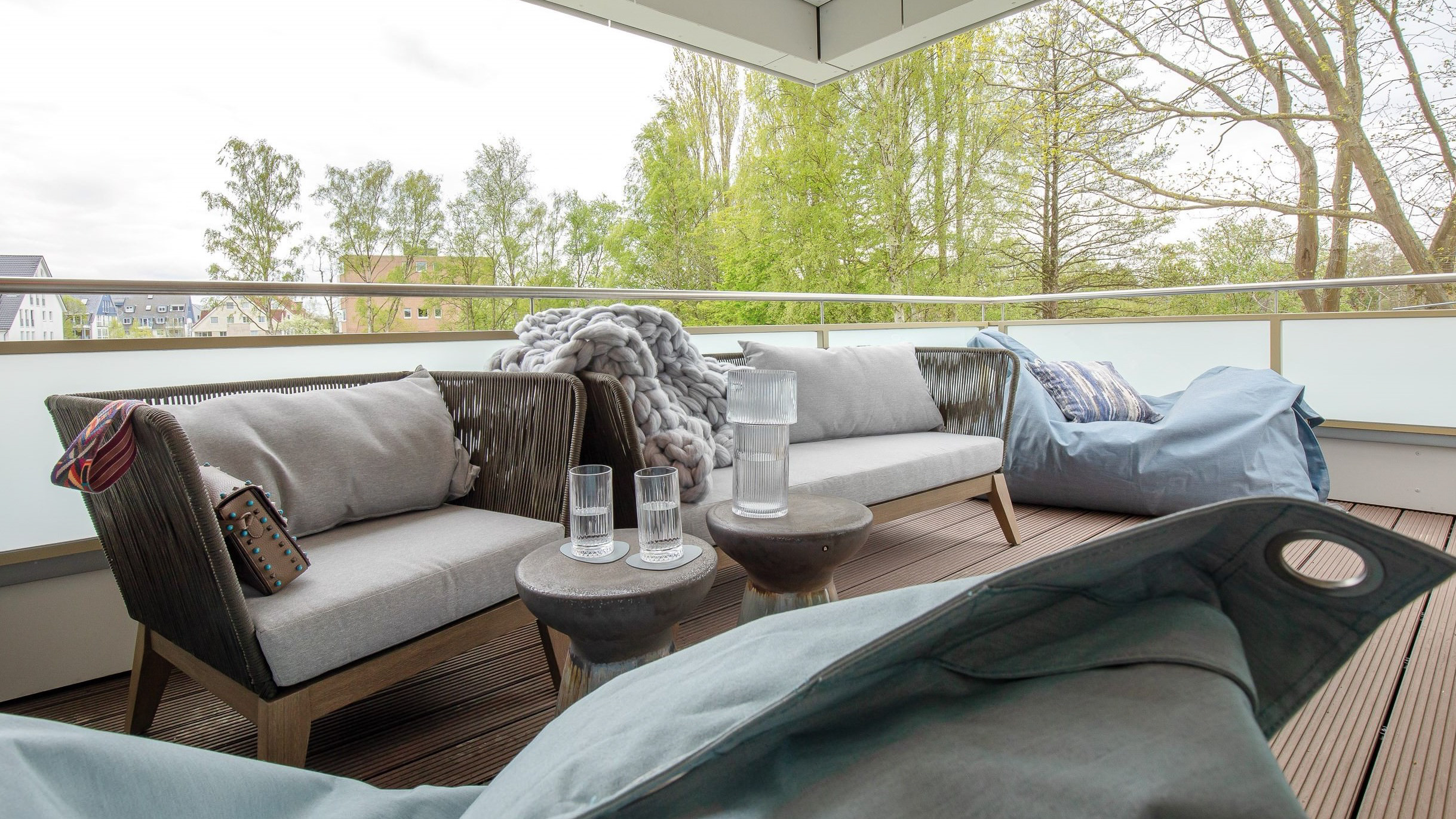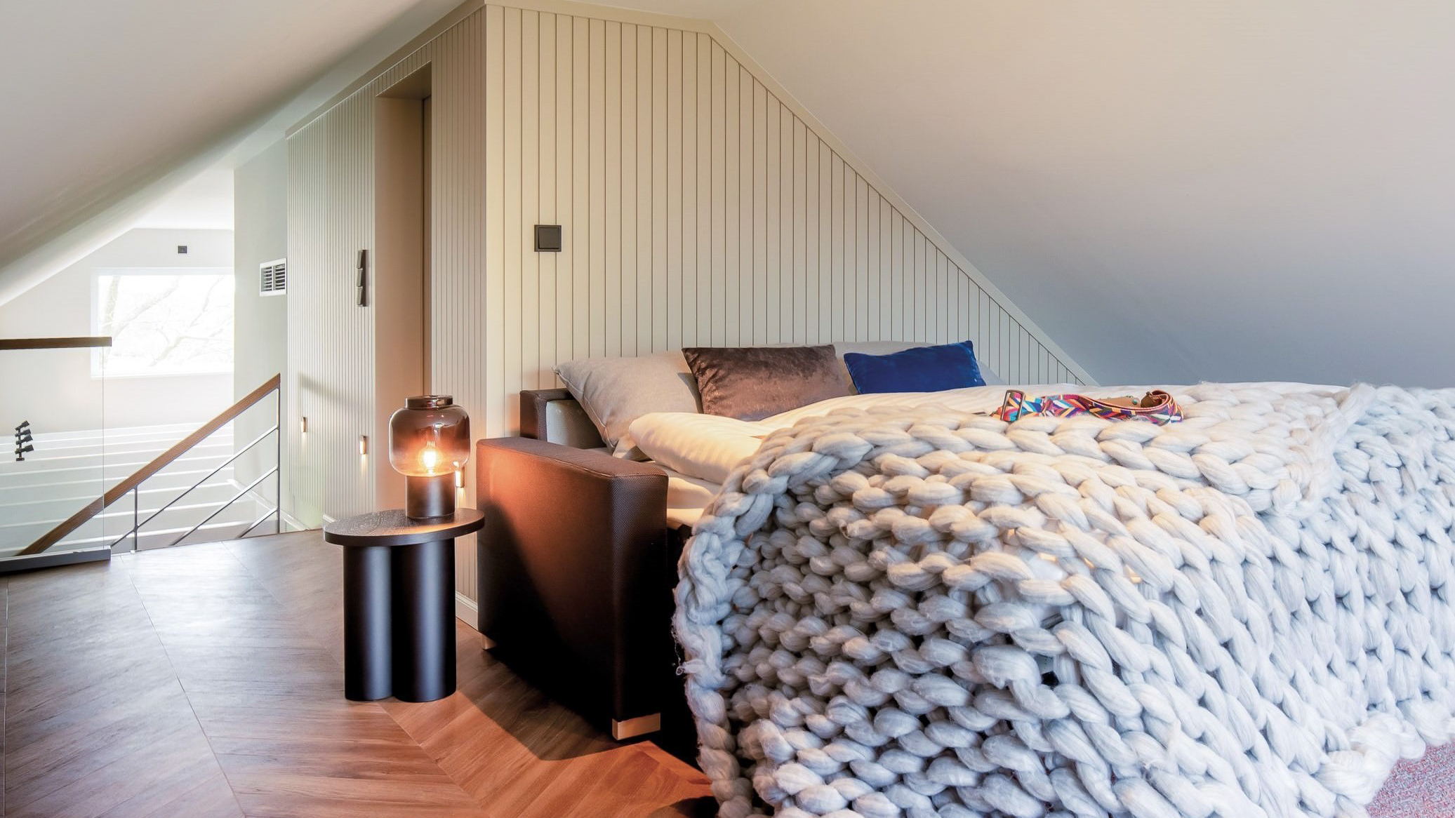 Gehen Sie nun nach oben in den Spitzboden über dem Penthouse. Hier können nicht nur ein bis zwei weitere Personen schlafen – es ist auch ein besonders gemütlicher Rückzugsort. Die Relaxmöbel laden zum Verweilen ein. Schauen Sie auch vom Spitzboden weit hinaus auf die Ostsee und genießen Sie eine entspannte Urlaubszeit.