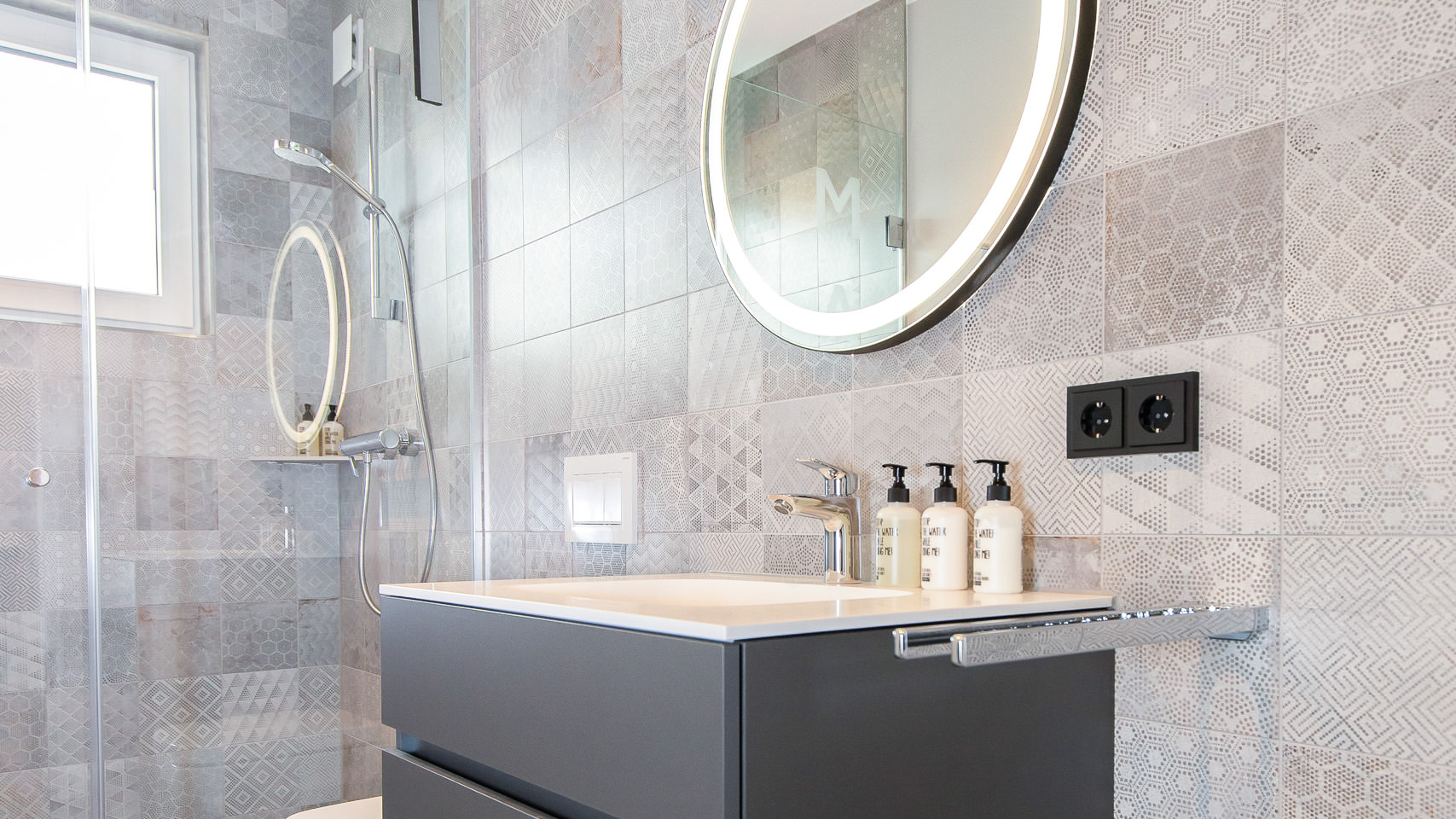 Zwischen den Schlafzimmern finden Sie das Bad mit einem Highlight: Aus der bodengleichen Dusche geht der Blick direkt aufs Meer hinaus, als Vorgeschmack auf den Tag am nahen Strand.