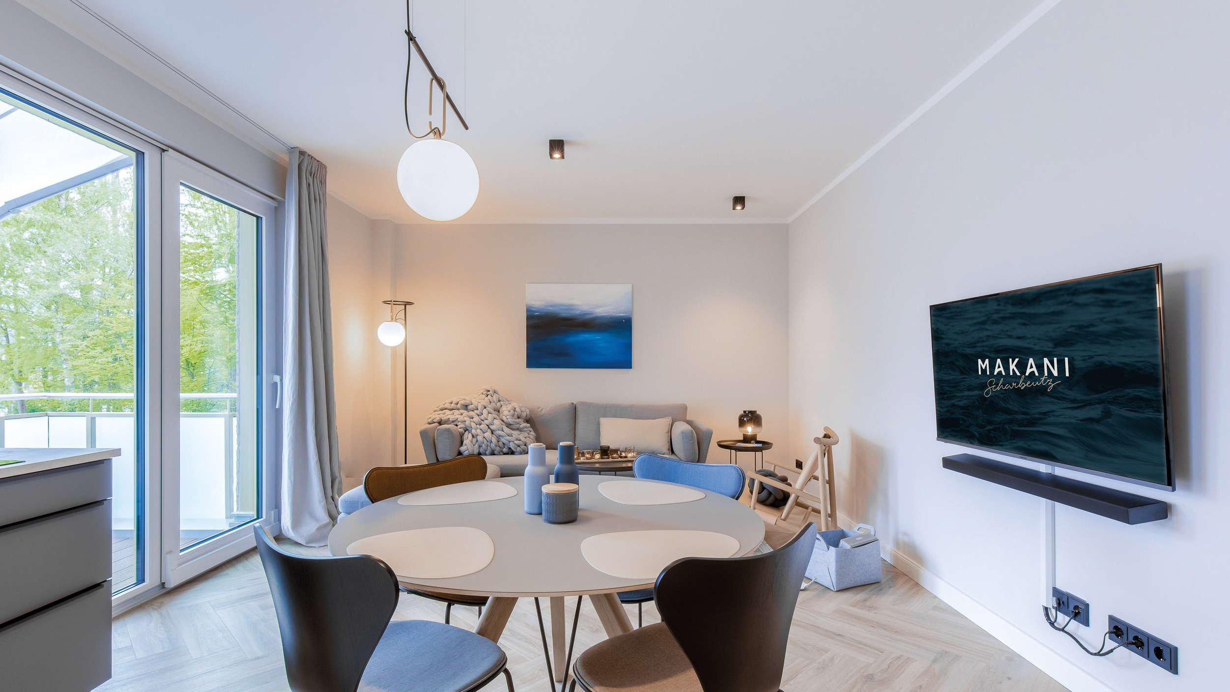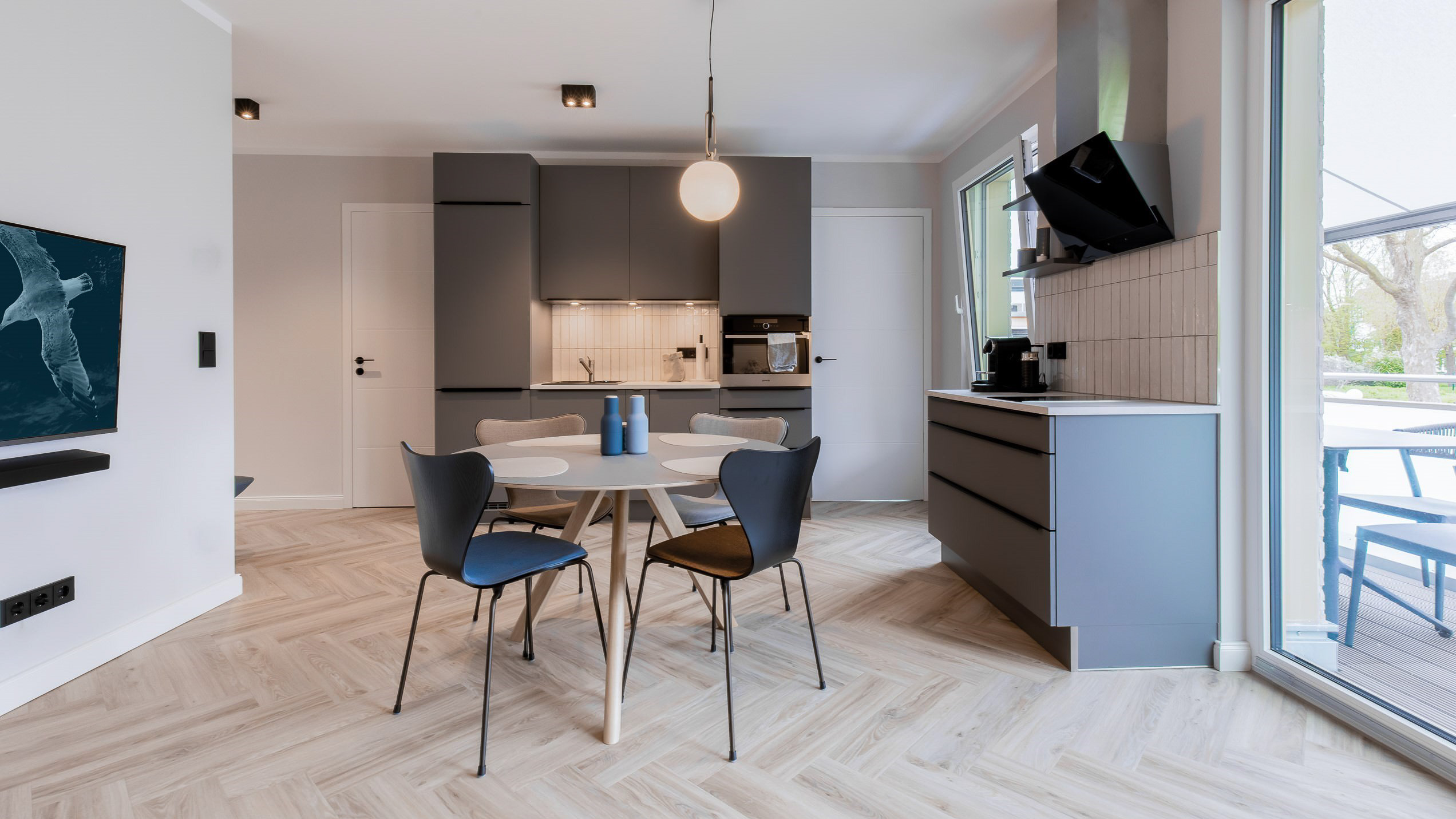 Bewegen Sie sich entspannt im offenen Ess- und Wohnbereich des Appartements. Kochen Sie gemeinsam in der modernen Küche und essen und sitzen Sie in bester Urlausstimmung vor großen Fensterflächen. Ob Sitzfenster oder komfortable Möbel in skandinavischem Stil: Es steht alles für Sie bereit. An das Wohnzimmer grenzt der große Südbalkon an. Hier genießen Sie im Sommer die Sonnenstrahlen. Ist es kühler, lassen Sie sich einfach den Rücken vom Infrarotheizstrahler, angebracht an der Hauswand, wärmen. Das Appartement Makani 4 hat eine Ausstattung, die Ihnen zu jeder Jahreszeit einen traumhaften Urlaub ermöglicht.