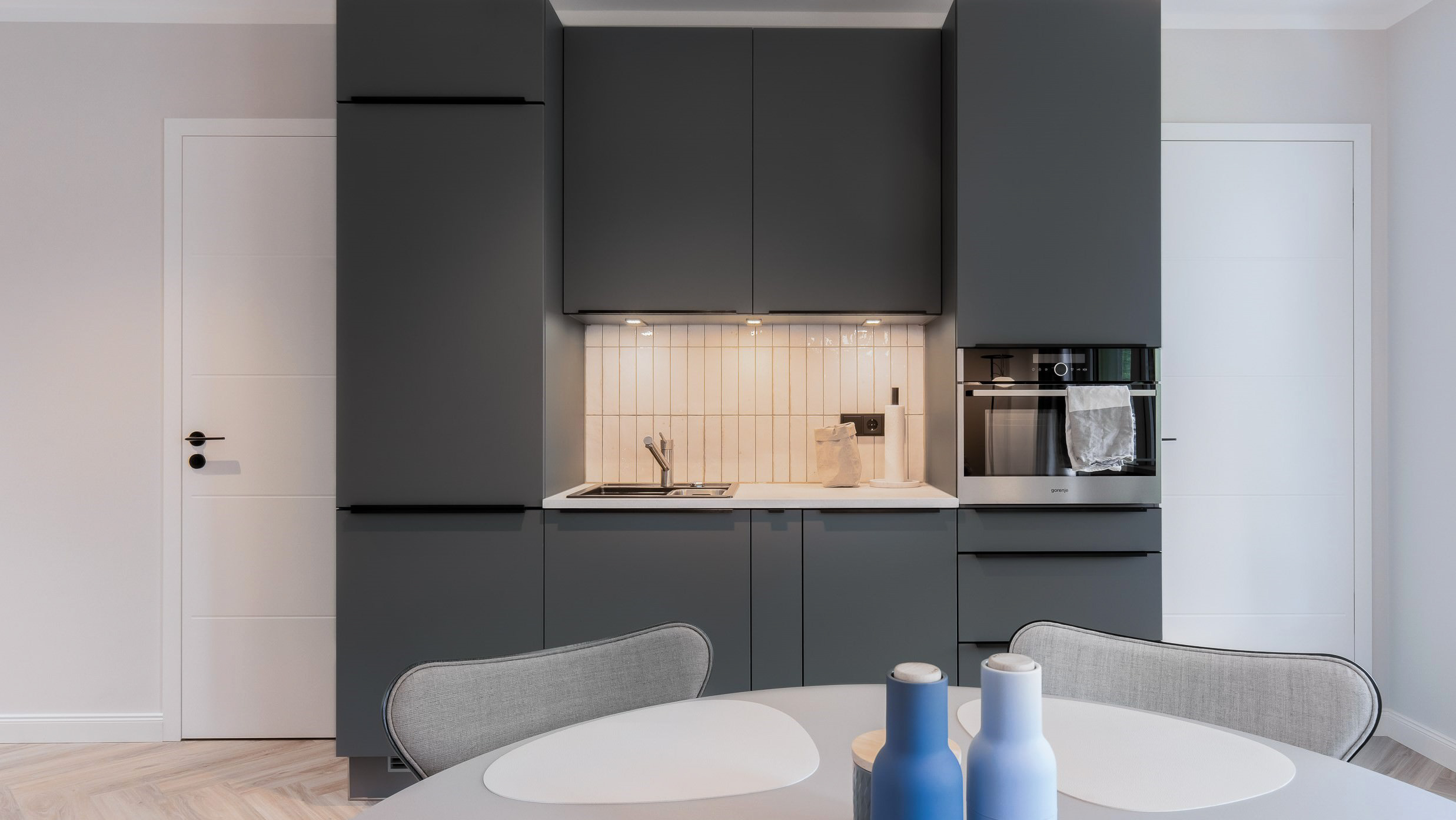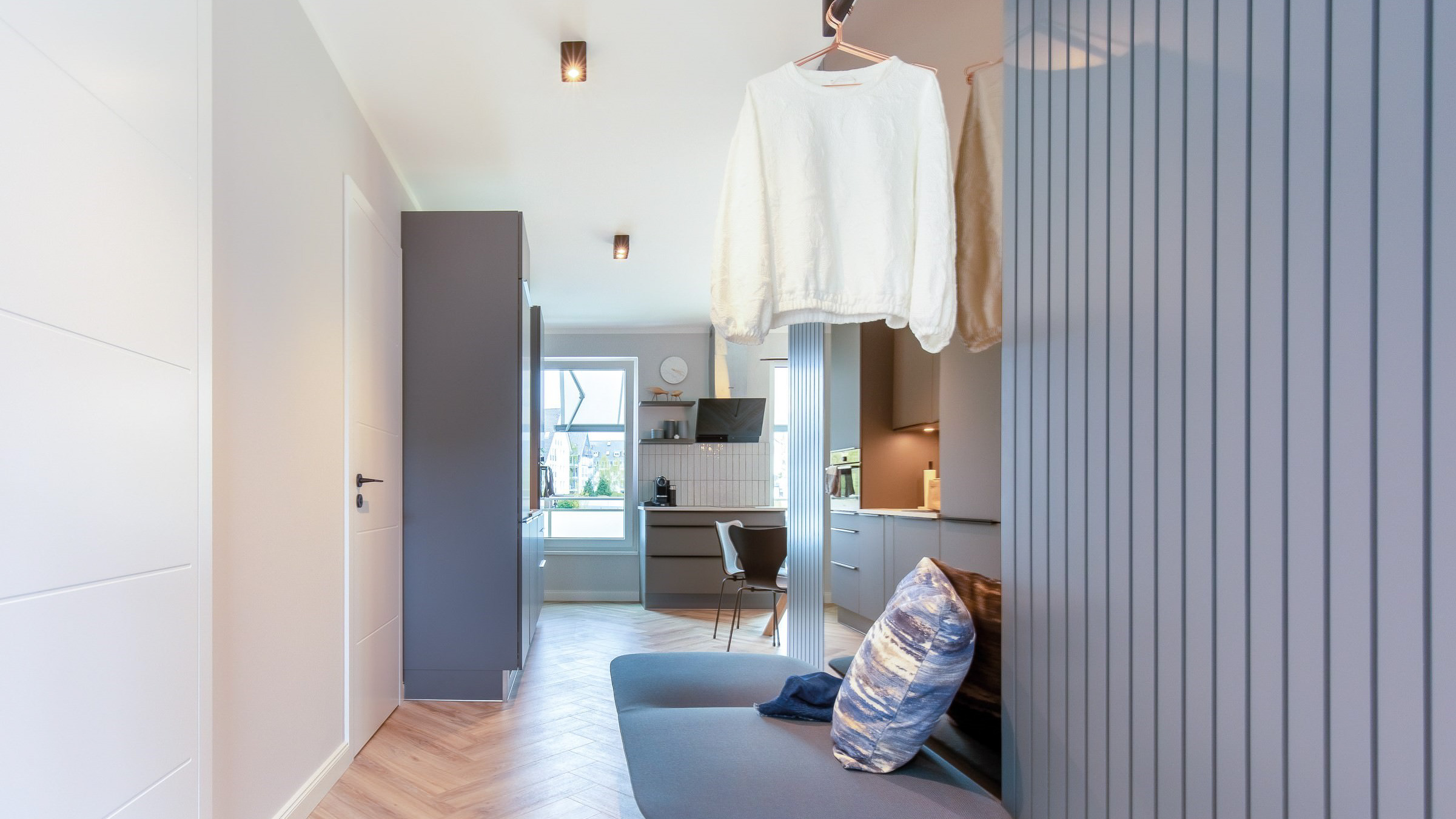 Mit dem Aufzug oder über die Treppe sind Sie schnell im ersten Obergeschoss, im Ferienappartement 4. Die Räume sind perfekt, um sich von 0 auf 100 in Urlaubsstimmung zu versetzen. Ob Sie mit guten Freunden oder mit größeren Kindern an die Ostsee reisen wollen: Das Makani 4 erwartet Sie mit modernem Wohndesign. Vom Entree aus betreten Sie das erste Schlafzimmer. Es ist ausgestattet mit einem großzügigen Bett und einem herrlichen Blick durch das große Fenster. Ein weiterer Schlafraum befindet sich auf der anderen Seite des Bades, sonnendurchflutet dank des großen Südfensters.