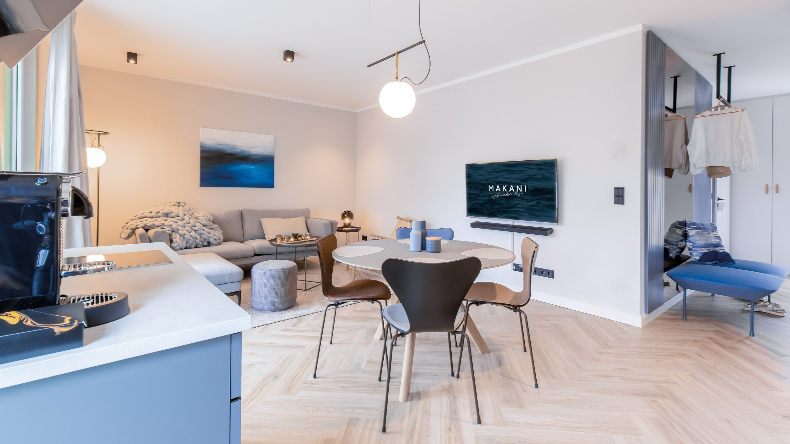 Viel Platz für vier Personen finden Sie bei Makani im ebenerdigen Ferienappartement 2. Beim Eintreten gelangen Sie durch das ansprechende Entree in den offenen Wohn- und Speiseraum. Seine Einrichtung zeigt sich in einem angenehm reduzierten, skandinavischen Stil: mit offener Küche, Esstisch, bequemen Polstermöbeln und Sitzfenstern. Der Übergang auf die Südterrasse ist fließend – frühstücken Sie doch einfach dort draußen und genießen Sie die Sonne.